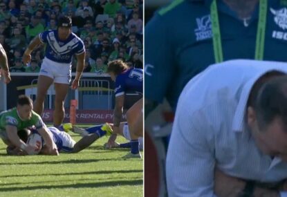Tom Starling was ruled to have been tackled before getting up to score, and neither the Canberra coach nor commentator Mick Ennis could believe…